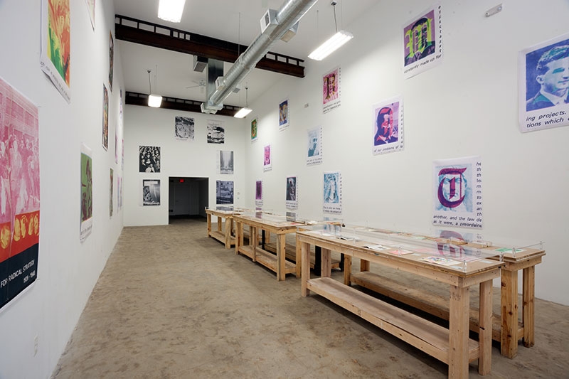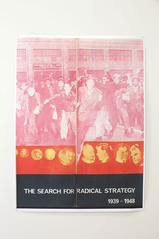 The co-op was open to anyone willing to maintain and work with the machines. Founding member Fredy Perlman was a prolific and widely respected political writer and thinker. His experiments with overprinting, collage, and typography belie an interest in printing machines and in the visual appearance of the items made with them. The posters on the wall are enlarged details scanned from books printed by Perlman, who often worked in collaboration with others.